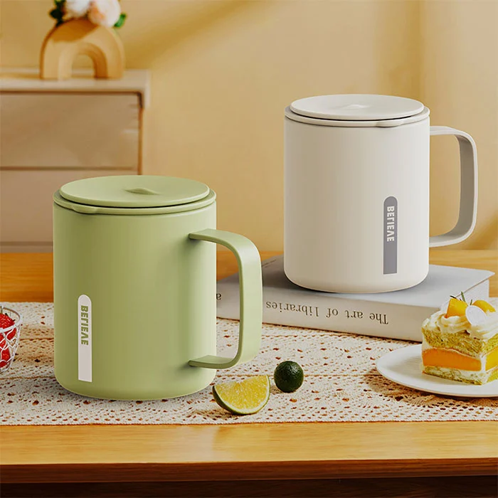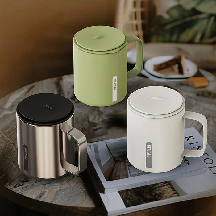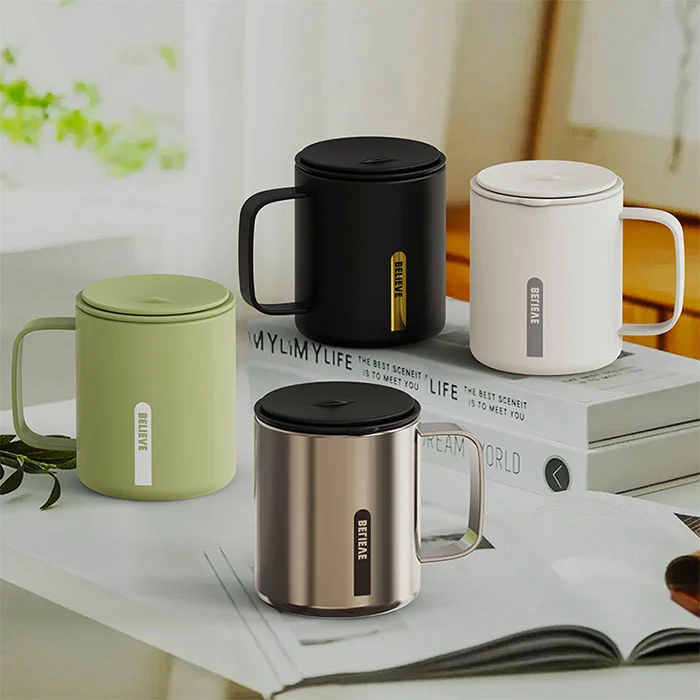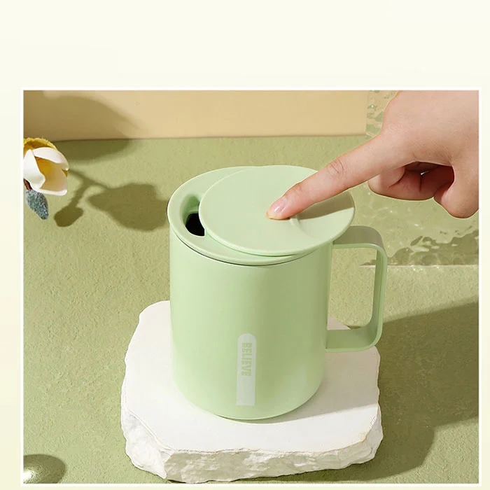 Ilgą laiką sėdint biure geriant vandenį, vienu spustelėjimu atidaromas dangtis netrukdo darbui, suteikia izoliaciją ir vėsinimą, tinka prie kavos ir arbatos;