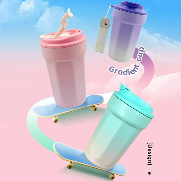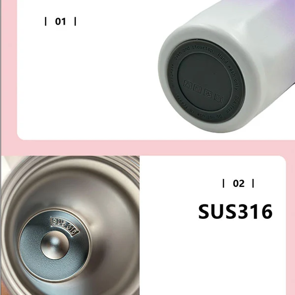 Tai vakuuminis izoliuotas nerūdijančio plieno butelis su šiaudais, medžiaga pagaminta iš 316 nerūdijančio plieno (vidinės dalies) ir 201 nerūdijančio plieno (išorinė siena), talpa yra 500 ml.